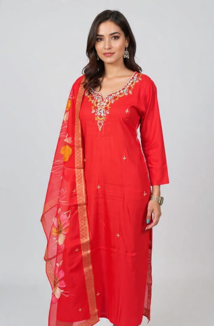 A sophisticated red blossom three-piece suit featuring a beautifully hand-embroidered V-neckline that adds refined charm to the look. The kurta is adorned with delicate scattered motifs, paired with straight-fit trousers for a sleek silhouette. The floral printed dupatta with a subtle golden sheen completes the ensemble, making it perfect for festive gatherings, family functions, and elegant daytime events.